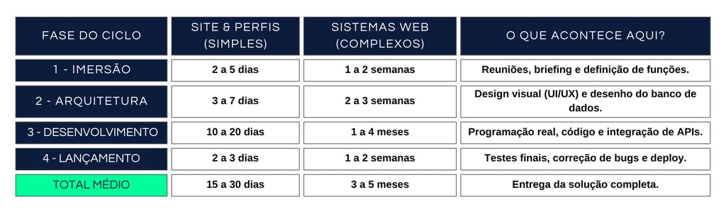 Trabalhamos com janelas de entrega baseadas na complexidade do seu projeto. Para a sua ideia específica, estimamos que o Ciclo UplyTech percorra todas as fases em aproximadamente [X] semanas, garantindo que a qualidade técnica acompanhe a agilidade que seu negócio exige.